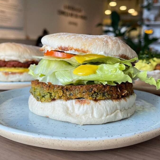 Pão d'água, hambúrguer de falafel, maionese de tofu, alface, tomate, cebola roxa e mostarda.