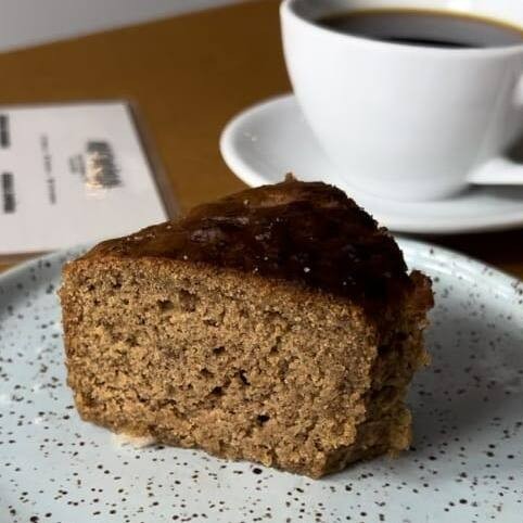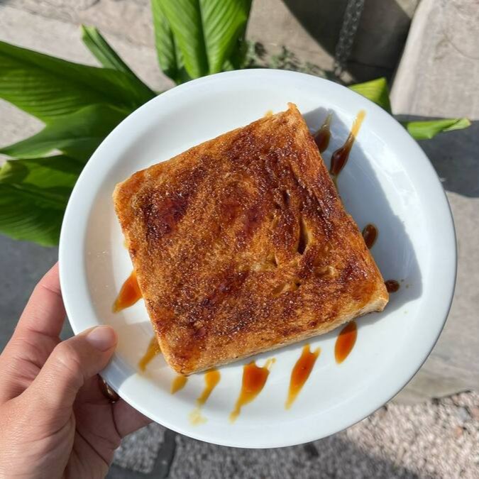 Pão de fermentação natural de forma umedecido com leite de aveia Naveia, selado na manteiga vegana e finalizado com açúcar e canela e melado.