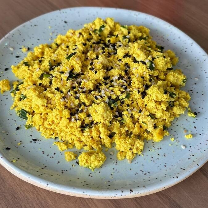 150g de tofu mexido com cúrcuma, pimenta do reino sal, negro e cebolinha.