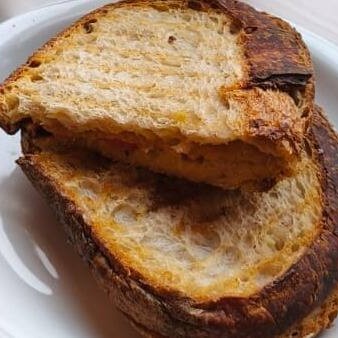 Pão de fermentação natural da Maçã e muçarela vegetal produzida no Mornings à base de castanha de caju.