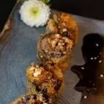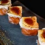 4 Unidades - Salmão Flambada Envolvida No Arroz Com Recheio De Salmão E Creme Cheese,Queijo Brie Coberto Com Mel.