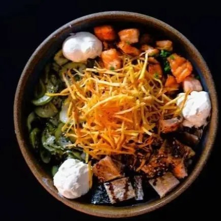 Nosso 'Poke de Salmão Grelhado' é uma verdadeira delícia! Apresenta tenros cubos de salmão grelhados à perfeição, que harmonizam de maneira única com o arroz levemente adocicado. Acompanha um delicioso 'Crispy' de batata, que agrega uma