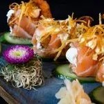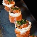 4 Unidades - Enrolado de salmão, cream cheese e geleia de maracujá.