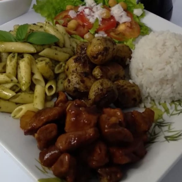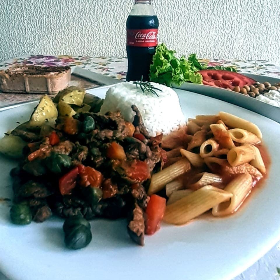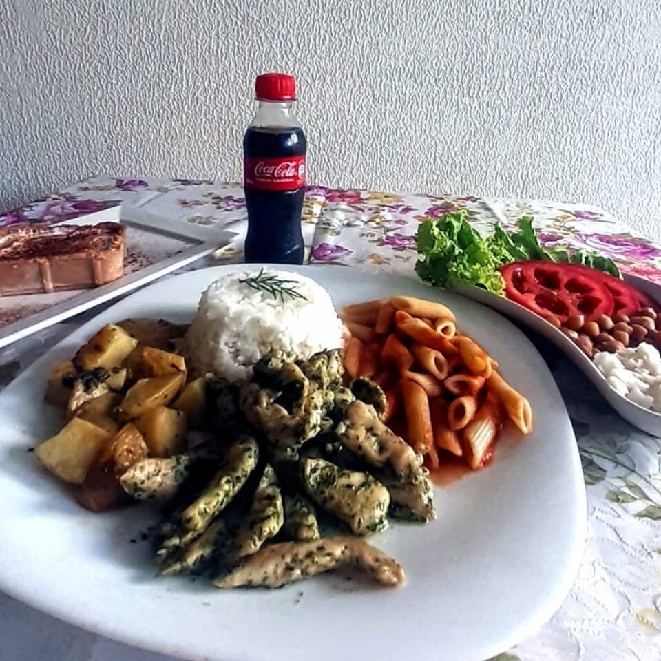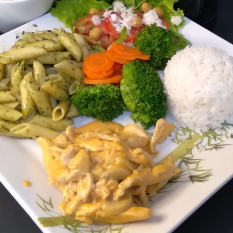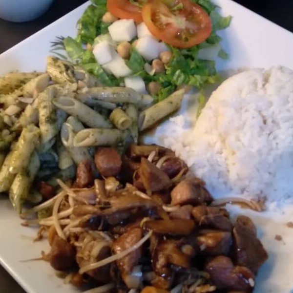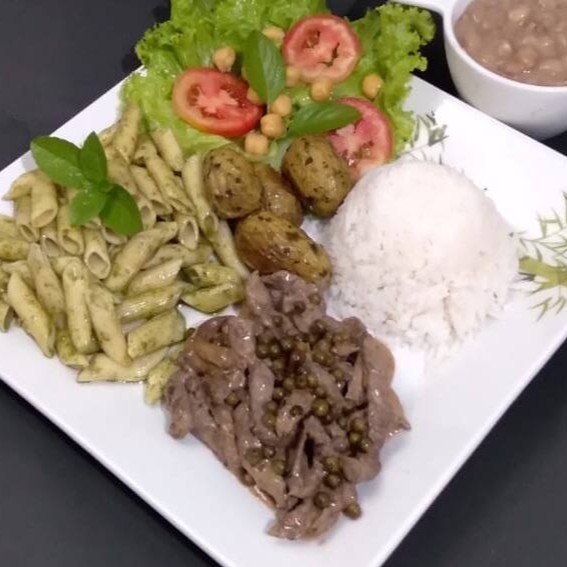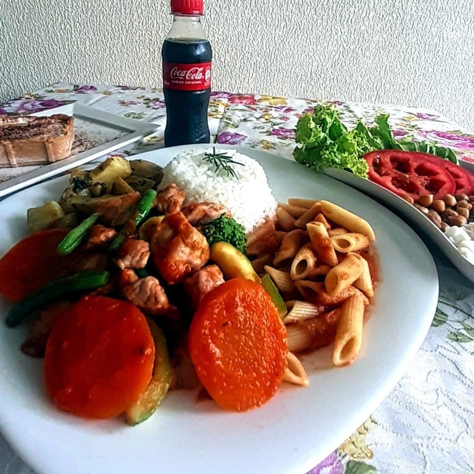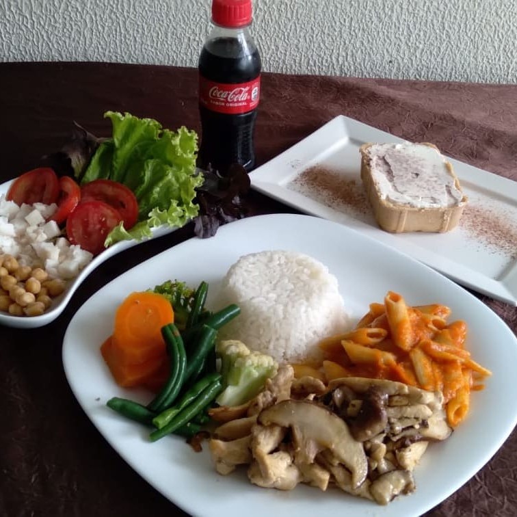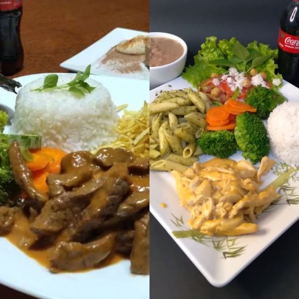 Strogonoff de carne, arroz, feijão carioca, penne, legumes na manteiga e batata palha. Tiras de peito de frango ao molho pesto, arroz, feijão carioca, penne e batata assada com ervas. Acompanha Salada(folhas verdes, grão de bico, tomate e palmito) 1 Coca Cola 200ml Obs: Se quiser pratos com os molhos das massas diferentes especifique.