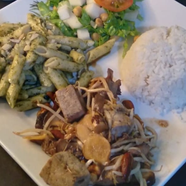Pernil gengibre, cogumelos frescos, noz, castanhas, amendoa, moyashi e molho tarê, arroz, feijão carioca, penne e legumes na manteiga Acompanha Salada(folhas verdes, grão de bico, tomate e palmito) 1 Coca Cola 200ml