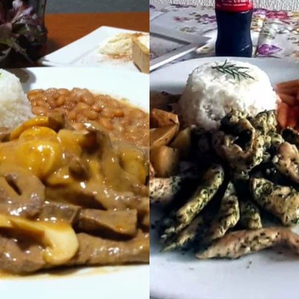 Tiras de alcatra ao molho madeira, arroz, feijão carioca, penne e legumes na manteiga Strogonoff de frango, arroz, feijão carioca, penne, legumes na manteiga e batata palha Acompanha Salada(folhas verdes, grão de bico, tomate e palmito) 1 Coca Cola 200ml Obs: Se quiser pratos com os molhos das massas diferentes especifique.