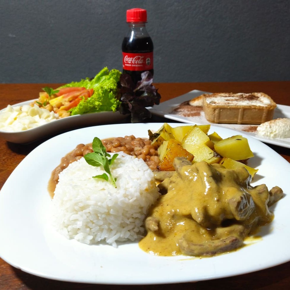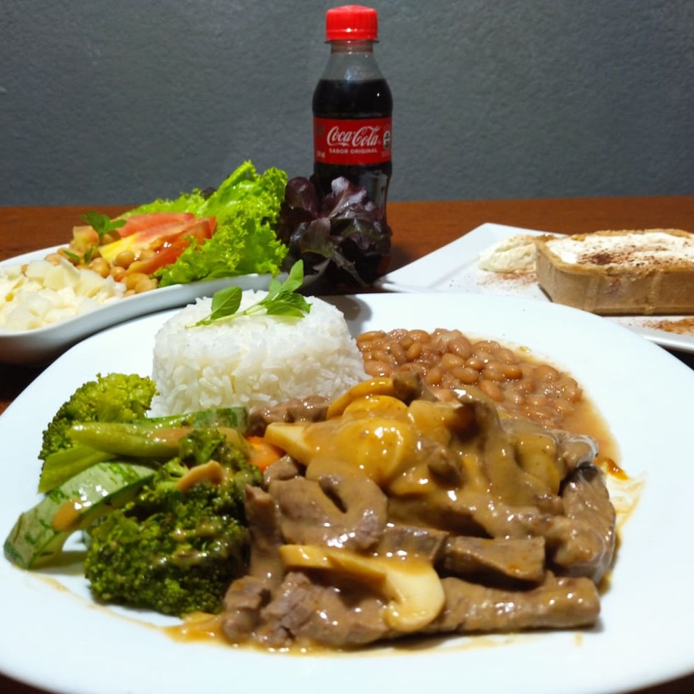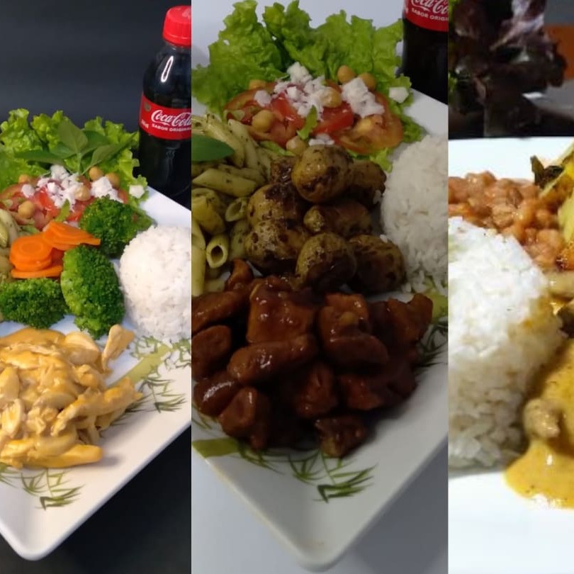 Tiras de alcatra ao molho de mostarda, arroz, feijão carioca, penne, batata assada com ervas. Strogonoff de frango, arroz, feijão carioca, penne, legumes na manteiga e batata palha Cubos de pernil suíno com abacaxi e molho barbecue, arroz, feijão carioca, penne e batata assada com ervas Acompanha Salada(folhas verdes, grão de bico, tomate e palmito) 1 Coca Cola 200ml