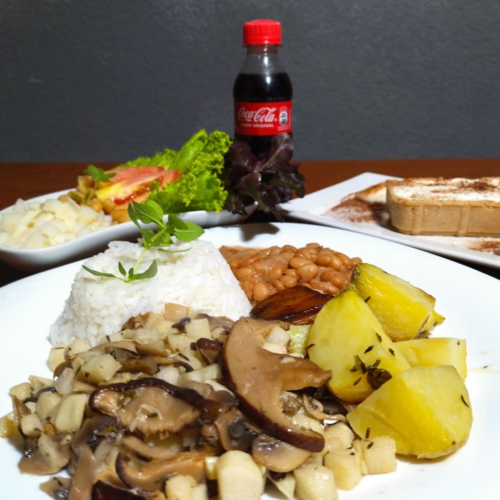 Desfrute do nosso 'Salteado de 3 Cogumelos com Palmito', uma oferta exclusiva para amantes de pratos vegetarianos e veganos. Este prato sublime apresenta um trio de cogumelos - shiitake, shimeji e paris - delicadamente salteados com palmito suculento, criando um sabor inesquecível. Acompanha um arroz perfumado, feijão carioca autêntico, penne al dente e batatas assadas com ervas aromáticas. Para completar a experiência gastronômica, oferecemos uma salada fresca e crocante, composta por folhas verdes, grão de bico, tomate e mais palmito, e uma refrescante Coca Cola de 200ml. Uma combinação de sabores que promete encantar o seu paladar.
