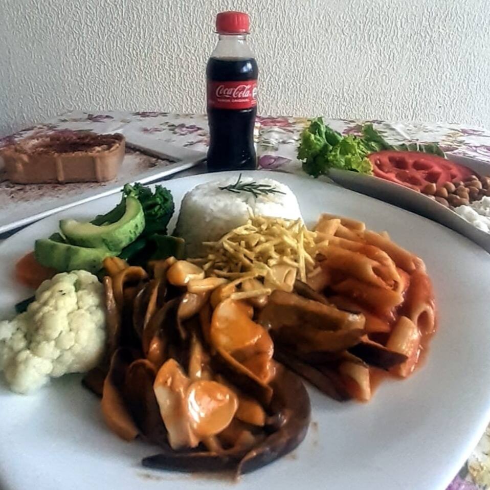 Tofu, gengibre, cogumelos frescos, noz, castanhas, amendoa, moyashi e molho tarê, arroz, feijão carioca, penne e legumes na manteiga Acompanha Salada(folhas verdes, grão de bico, tomate e palmito) 1 Coca Cola 200ml