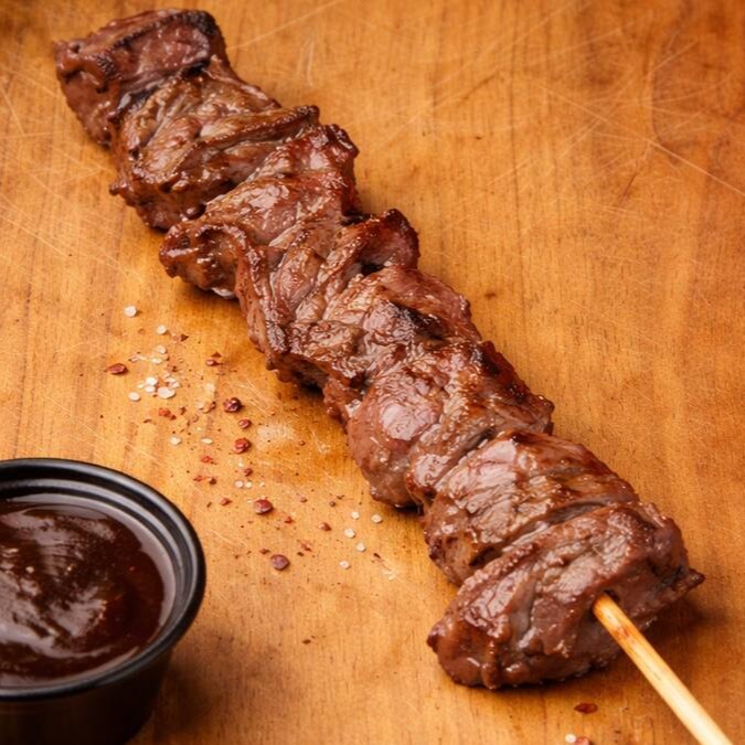 A Fraldinha Bovina com Gordurinha é suculência e sabor em cada mordida. Preparada com carne macia e bem marmorizada, ela vai à brasa até atingir o ponto ideal, realçando a gordura que derrete e deixa o espetinho ainda mais saboroso. O resultado é uma carne macia, com sabor intenso e aquele toque defumado irresistível, perfeita para quem aprecia um bom espetinho.