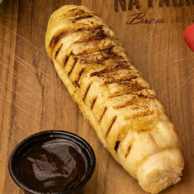 O Pão de Alho é dourado na brasa até ficar crocante por fora e macio por dentro, com recheio cremoso e sabor marcante de alho na medida certa. Um acompanhamento clássico do churrasco, perfeito para abrir o apetite ou acompanhar os espetinhos e uma bebida gelada.