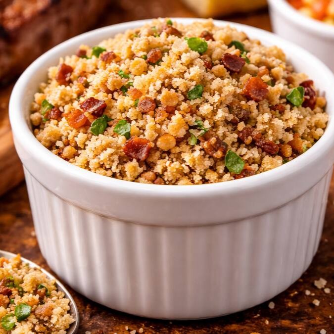 A Farofa Temperada da Casa é preparada com farinha bem dourada, ingredientes selecionados e tempero na medida certa. Saborosa, crocante e aromática, é o acompanhamento perfeito para realçar ainda mais o sabor das carnes e dos pratos da brasa.