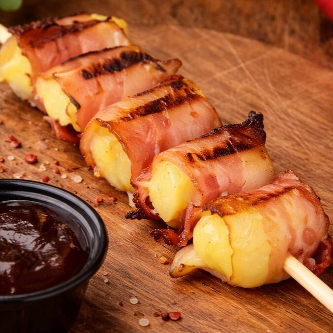 O Espetinho de Medalhão de Mandioca com Queijo e Bacon é puro conforto na brasa. A mandioca macia envolve um recheio cremoso de queijo, tudo abraçado por fatias de bacon douradas no ponto certo. O resultado é uma combinação irresistível de crocância, cremosidade e sabor defumado, perfeita para quem busca um espetinho diferente, marcante e cheio de personalidade.