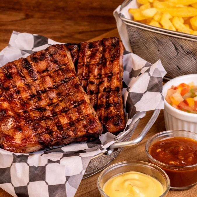 A Manta Suína é preparada na brasa até atingir o ponto ideal, com carne macia e suculenta por dentro e exterior bem dourado e saboroso. Acompanha porção de batatas fritas crocantes e vinagrete, formando uma combinação equilibrada e perfeita para compartilhar.