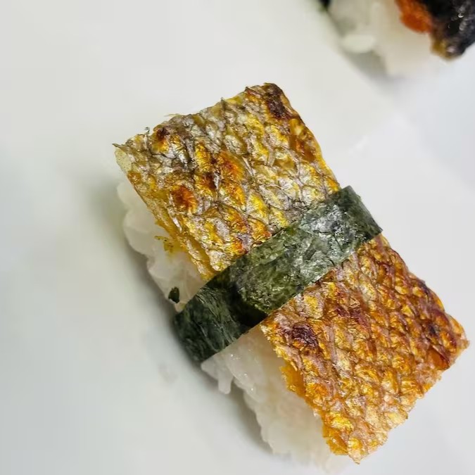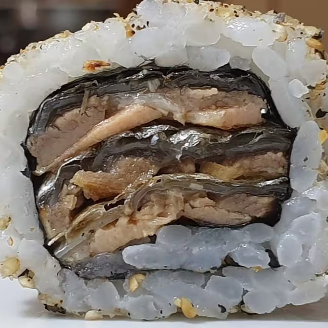 Enrolado com arroz e alga , recheado com pele de salmão grelhada