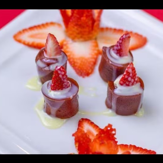 Cream cheese, envolto por tiras de goiabada, morango por cima, finalizado com leite condensado