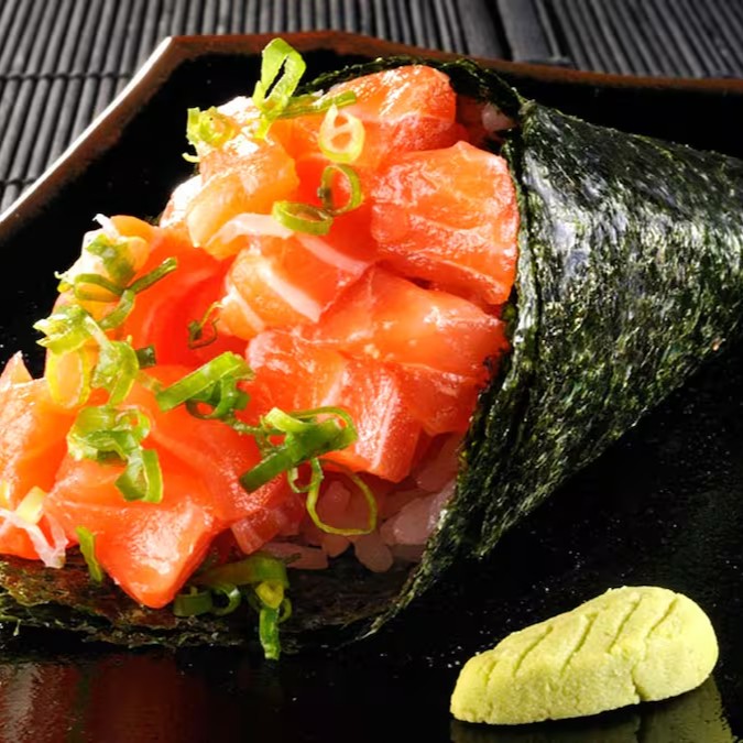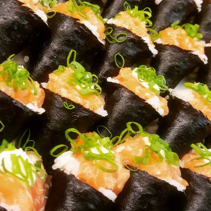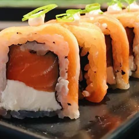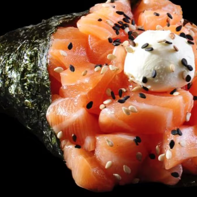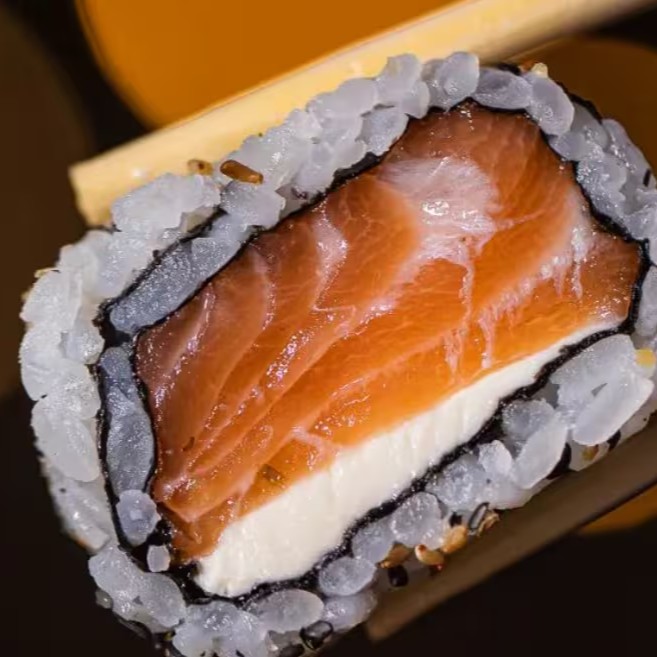 Arroz enrolado com nori, recheado com salmão, cream cheese, por cima uma lasca de salmão