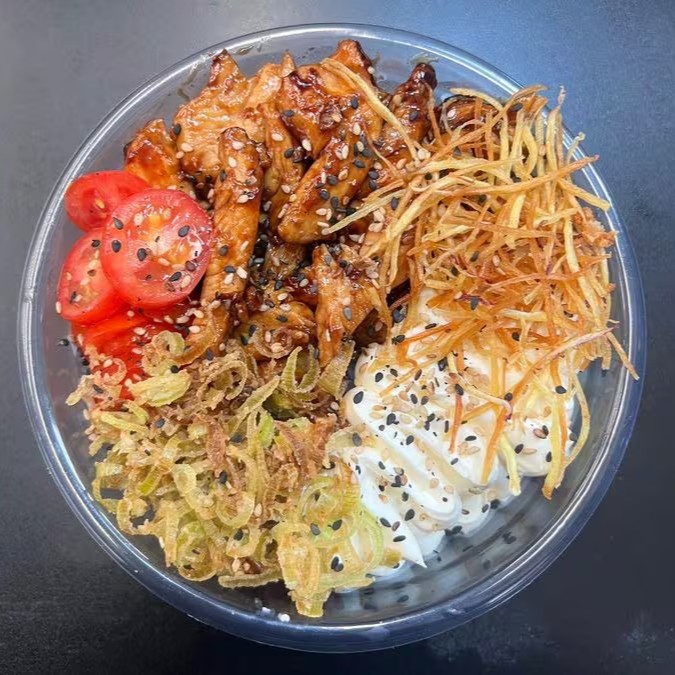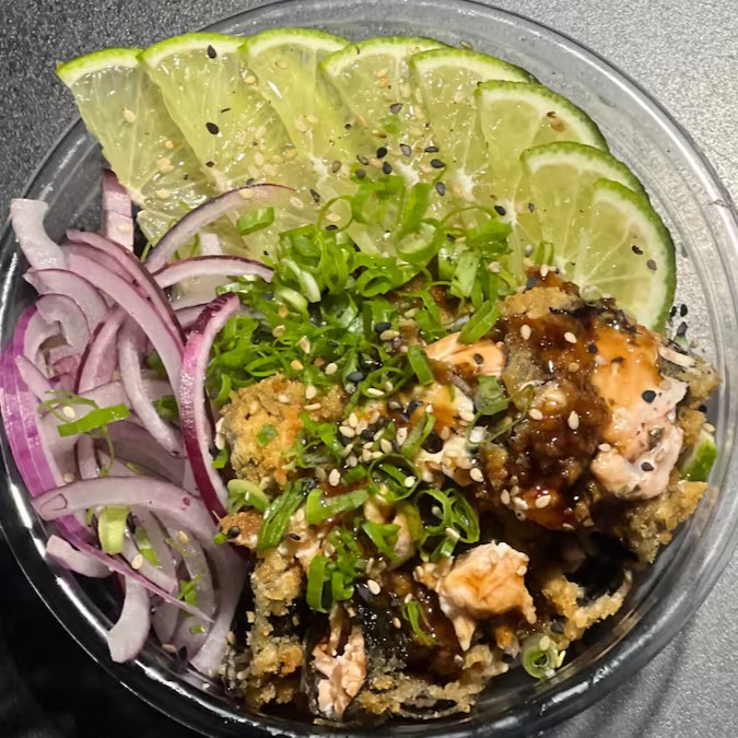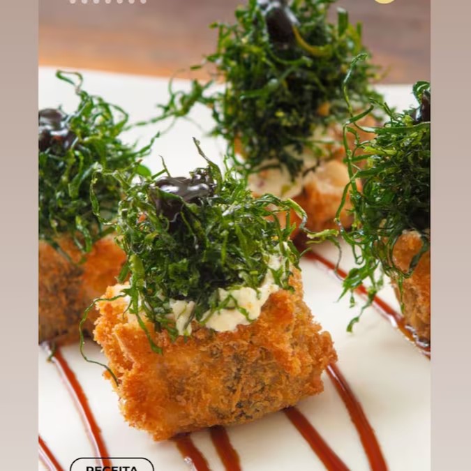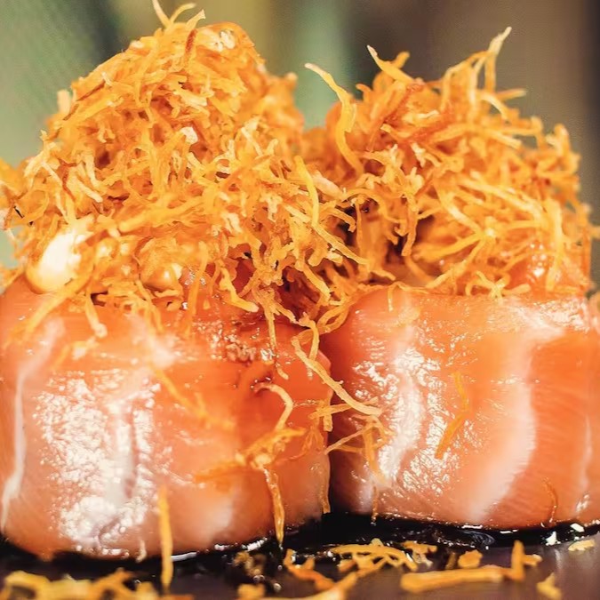 Bolinha de arroz, envolto por lascas de salmão, coberto com cream cheese, finalizado com crispy de batata doce