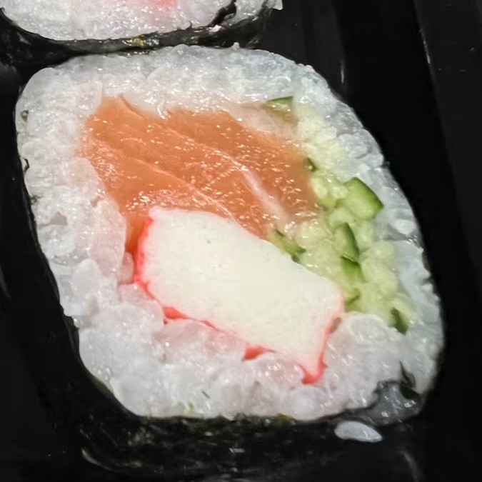 Enrolado com nori e arroz, recheado com salmão, Kani, Pepino japonês