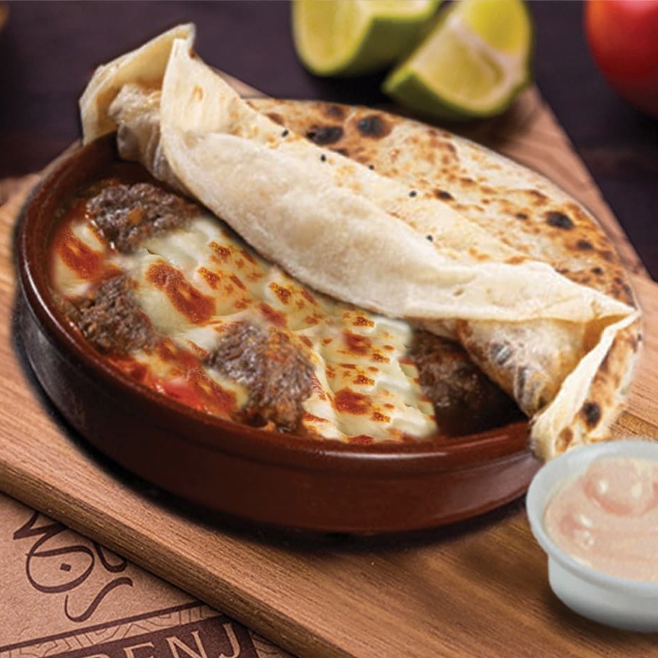 Carne moida bem temperada, cozidas em um molho vermelho aromático, e mussarela . Coberto por uma leve massa de pão árabe. Que é perfeita como prato principal do Oriente Médio.