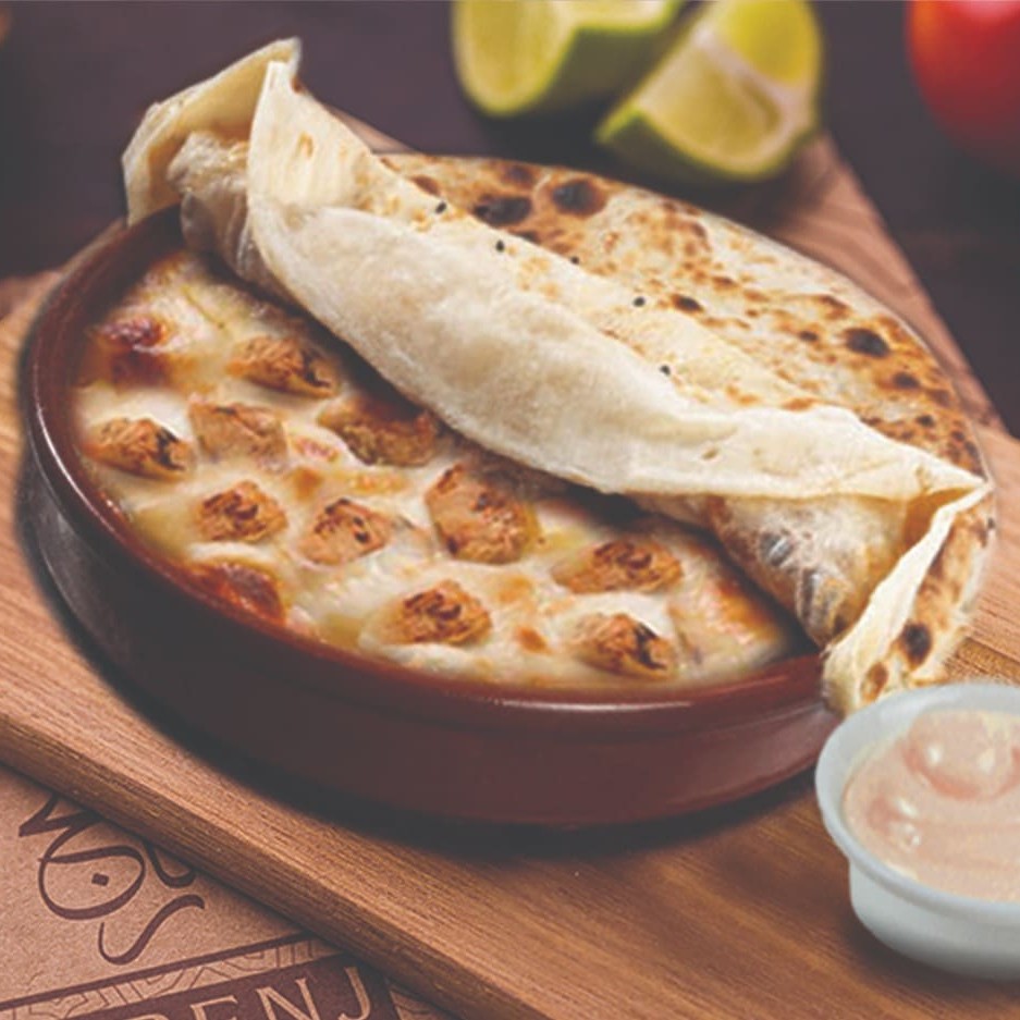 Cubos de peito de frango suculentos, assados no forno com um molho branco e vermelho cremoso, barbecue e queijo mussarela derretido. Coberto por uma leve massa de pão árabe. Uma opção deliciosa.