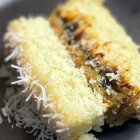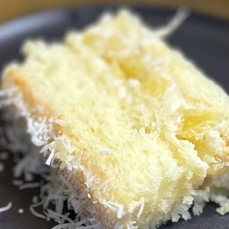 Massa leve com cocada cremosa e compota de abacaxi caseira. Um bolo gelado que combina o frescor da fruta com o aconchego do coco. Sabor de afeto em cada pedaço. Serve 1 pessoa - aproximadamente 140g
