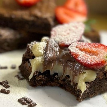 Nosso irresistível Brownie ganha um toque especial com uma cobertura extra cremosa de brigadeiro de leite Ninho, Nutella e morangos frescos suculentos!! Serve 1 pessoa - aproximadamente 180g ---------------Palavras-chave---------------------- Entrega rápida, frete grátis, promoção, cupom, melhor preço, doces, bolos, sobremesa, gourmet, confeitaria, doceria, bolo caseiro, brownie, brownie cremoso, brownie recheado, brownie gourmet, chocolate, brigadeiro, Nutella, Ferrero, Ninho, leite Ninho, avelã, creme de avelã, morangos, morango fresco