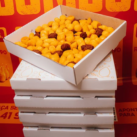 Caixa com 100 salgadinhos em até 5 sabores à sua escolha, para saborear e compartilhar.