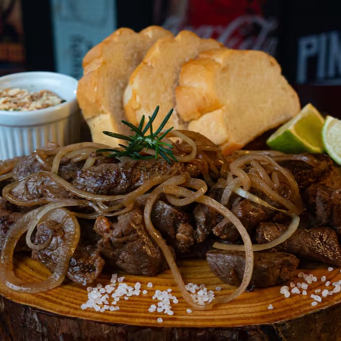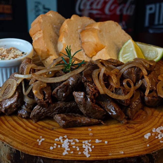 500 gramas (peso final) de mignon, 1 porção de farofa, limão cortado, cebola refogada e pão francês.