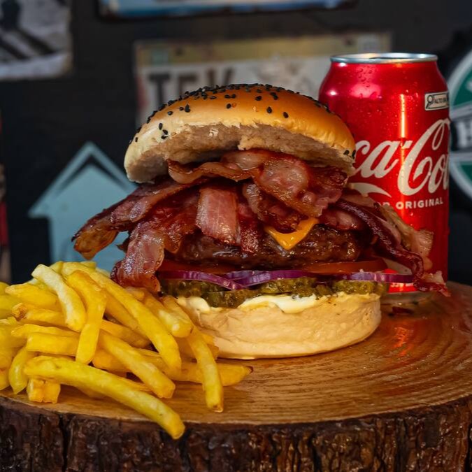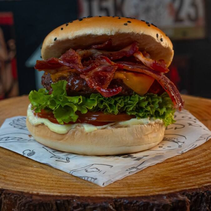 Delicioso hamburguer artesanal de 180 gramas, pão, maionese, picles, cebola roxa, tomate, alface, muito bacon e cheddar especial.