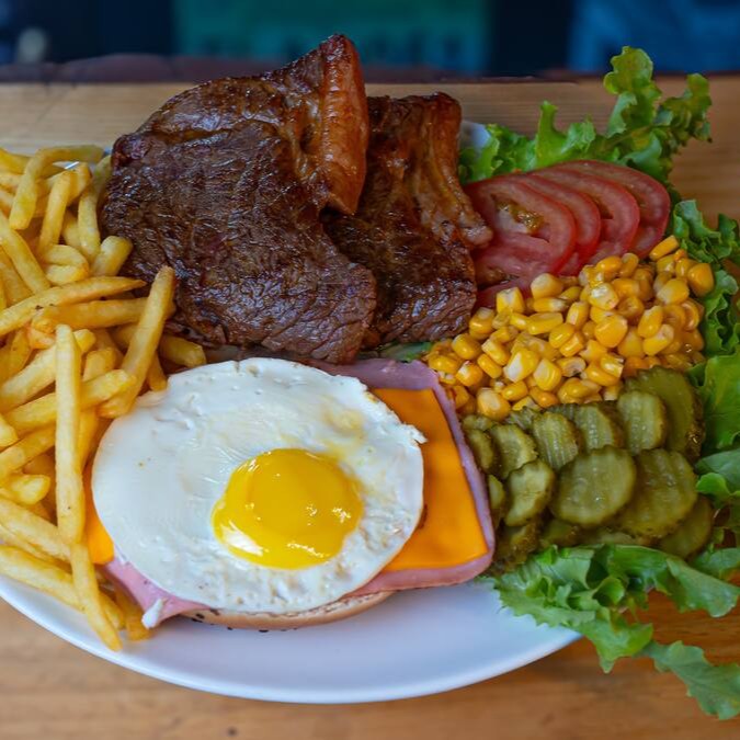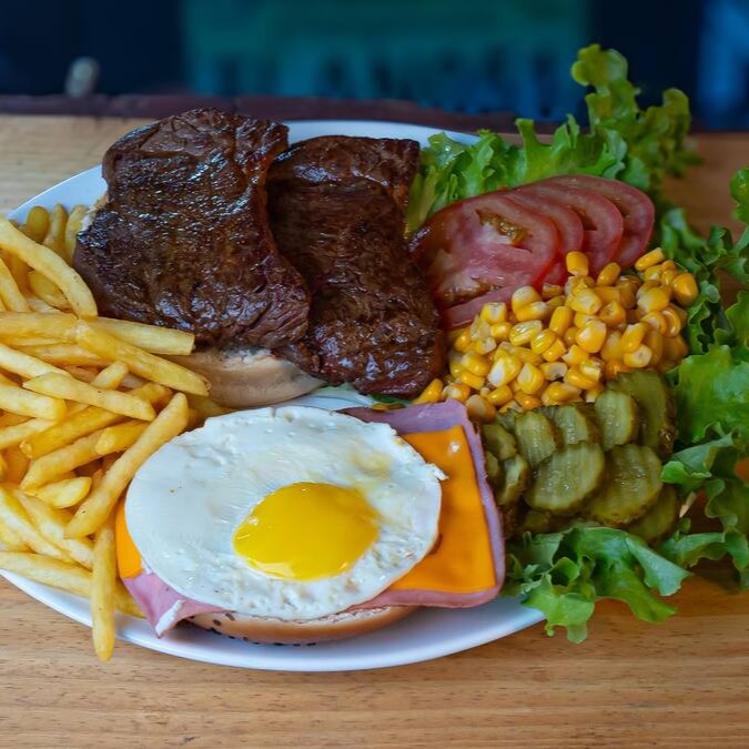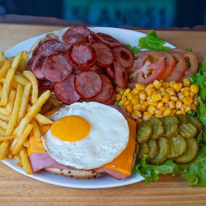 Alface, tomate, milho, picles, pão com gergelim preto, maionese, queijo, ovo, presunto, 120 gramas de batata frita e 200 gramas de alcatra grelhada.