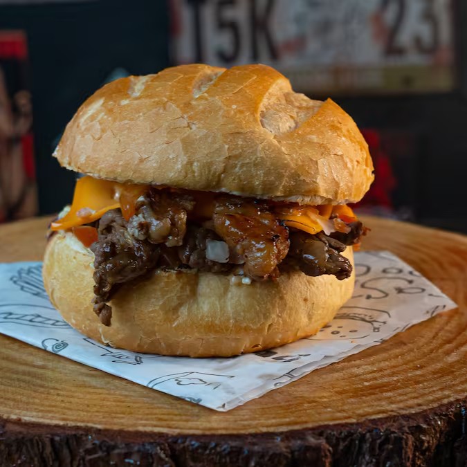 Pão francês, picanha Angus, queijo e molho vinagrete.