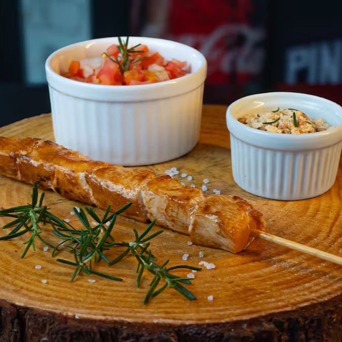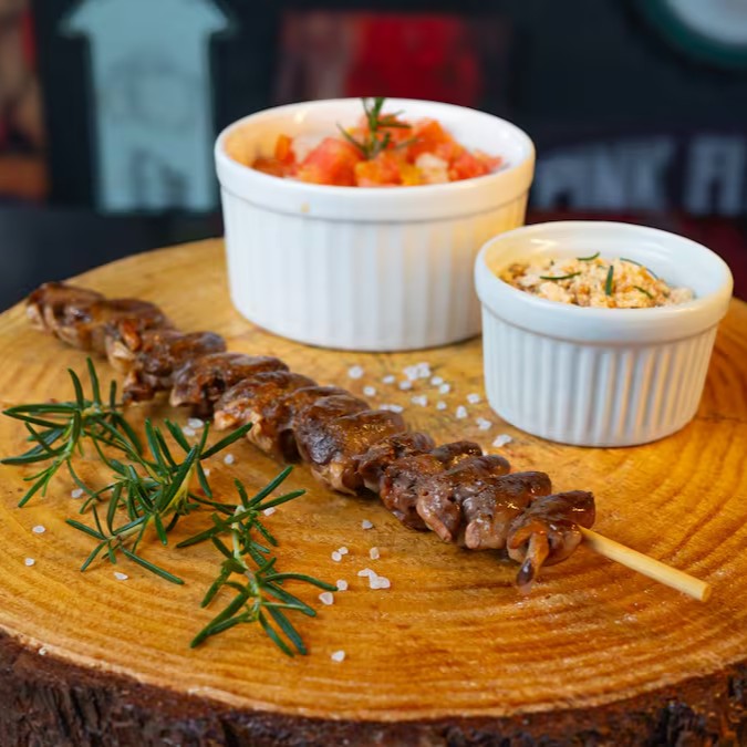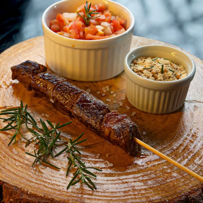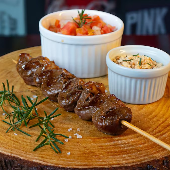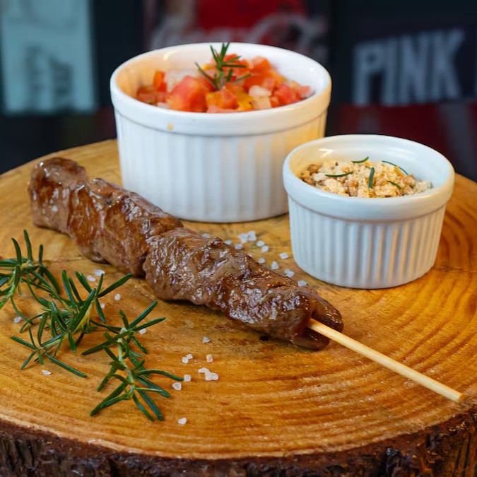 04 Espetinhos de Alcatra + 2 Farofas e 1 Vinagrete (Grátis)