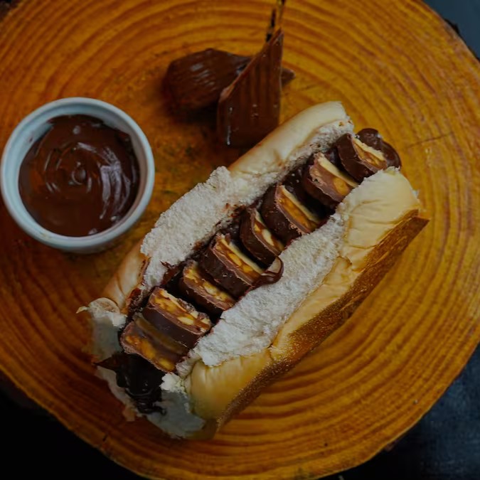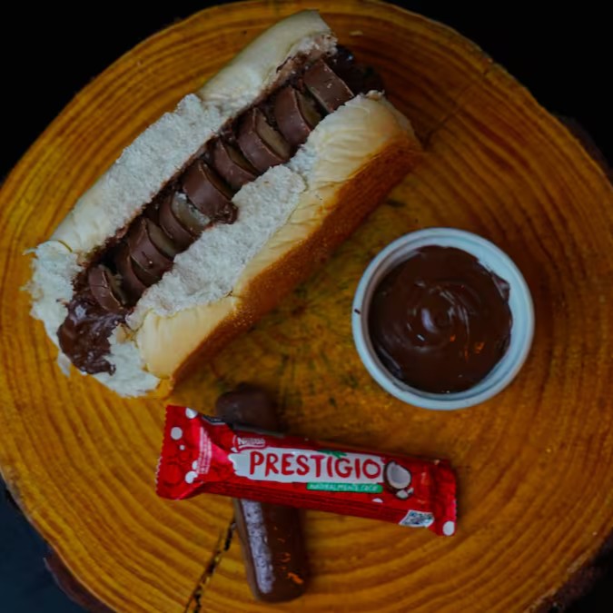 Descubra o encanto do nosso 'Prestígio', um hot dog doce irresistível. Este delicioso prato é recheado com um saboroso e cremoso chocolate preto, que proporciona uma experiência de sabor intensa, e realçada com pedaços generosos do icônico chocolate Prestígio. A harmonia perfeita entre o pão macio e a combinação de chocolates resulta em um prato doce, rico e indulgente. Ideal para os verdadeiros amantes de chocolate, que buscam uma explosão de sabores a cada mordida.