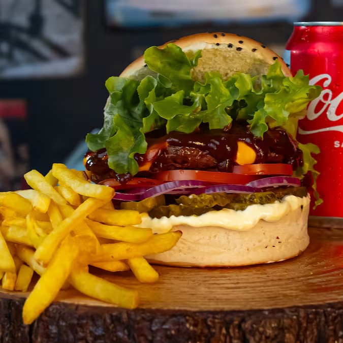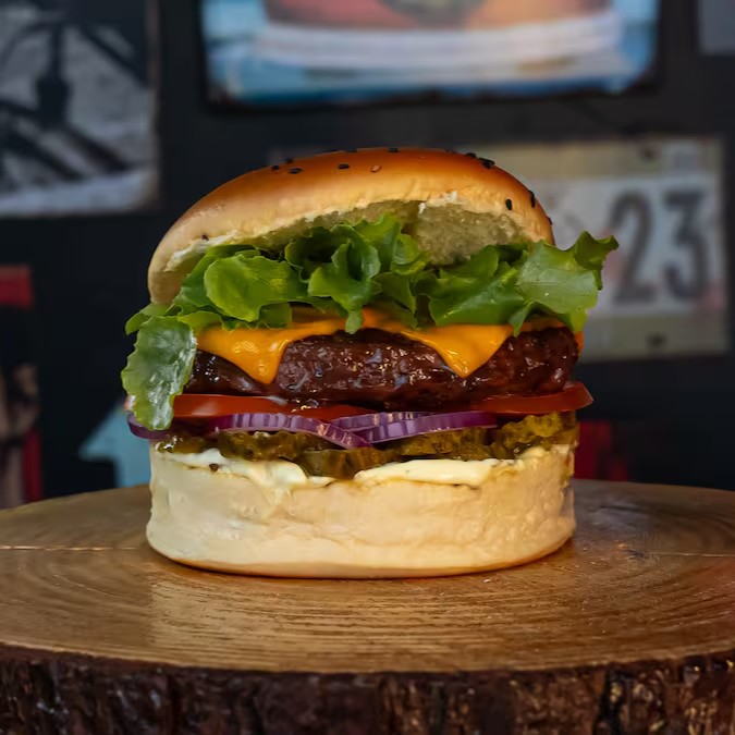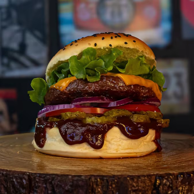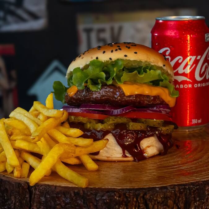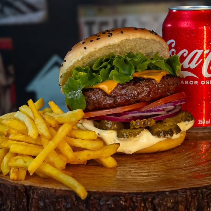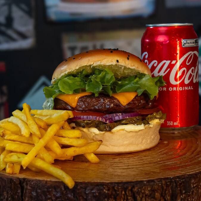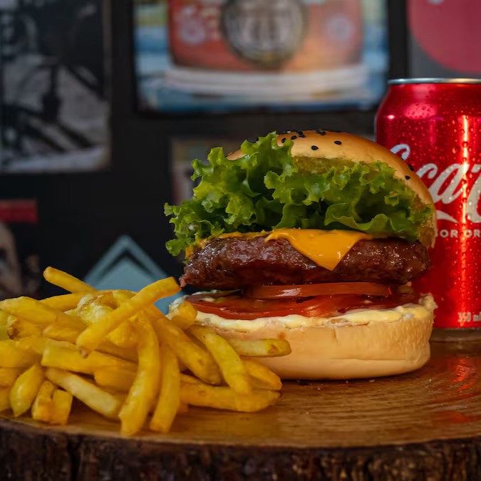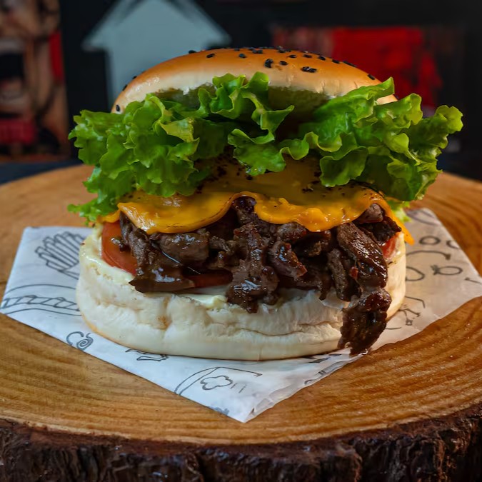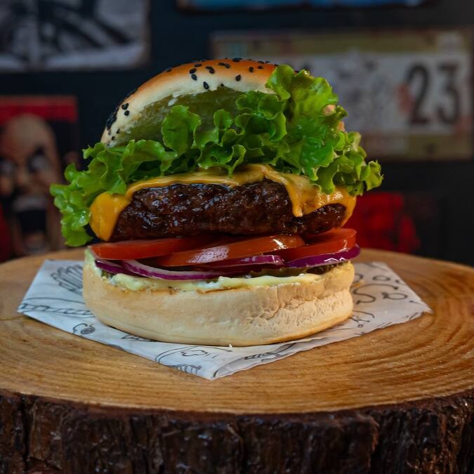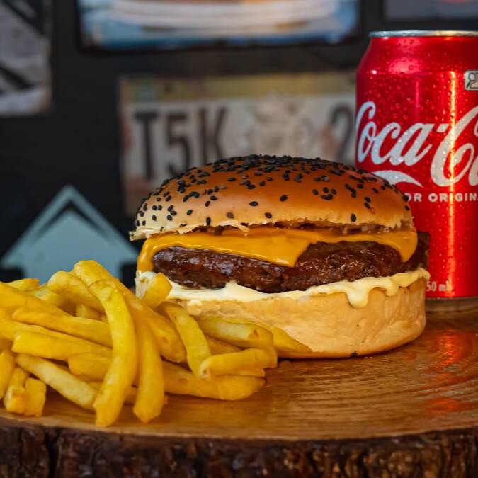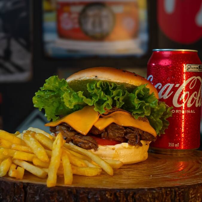 É uma deliciosa combinação de suculento hambúrguer artesanal 180 gramas, cuidadosamente acomodado em um pão com gergelim preto macio. Acompanhado de uma generosa porção de queijo cheddar derretido que se mistura harmoniosamente com o frescor do tomate maduro, picles crocantes e a crocância da cebola. Cada mordida é um deleite, acentuado pela cremosidade da maionese e o toque final de alface fresca. Este prato é uma verdadeira experiência gourmet na categoria de hambúrgueres artesanais.