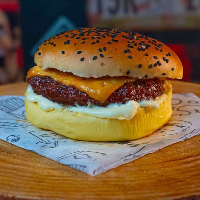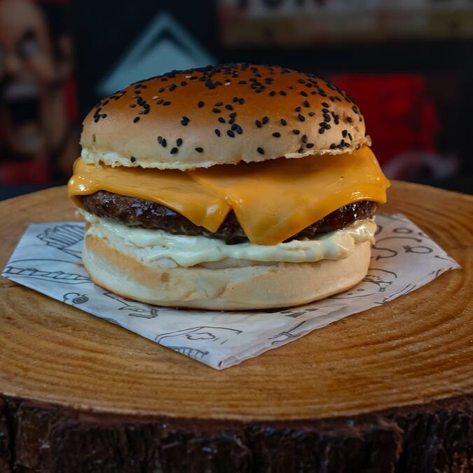 Pão com gergelim preto, maionese, hambúrguer artesanal de120 gramas e queijo cheddar.