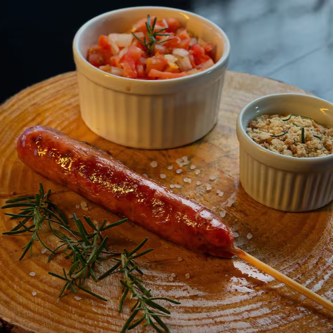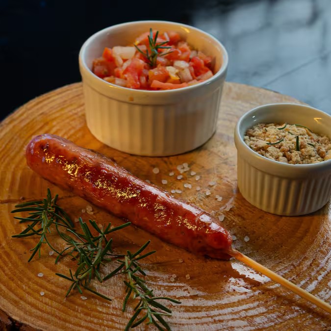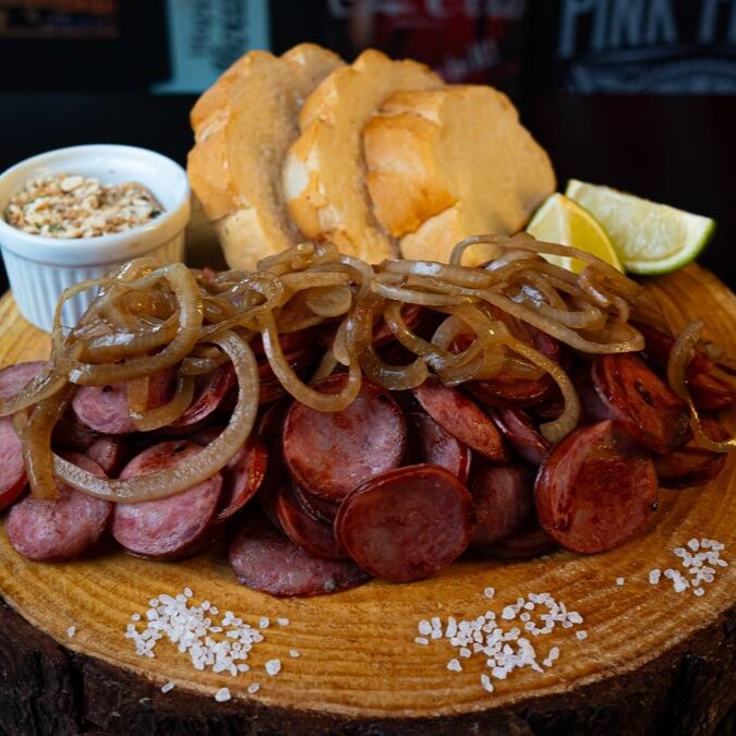 500 gramas (peso final) de calabresa, 1 porção de farofa, limão fatiado, cebola refogada e pão francês.