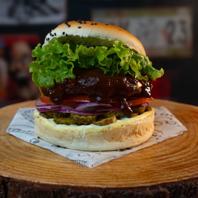 O 'Nobre Costela' é um hambúrguer artesanal de 180 gramas, feito com a mais saborosa costela Angus. O pão, especialmente macio, é salpicado com gergelim preto, dando um toque exótico ao prato. A maionese caseira, feita com ingredientes frescos, harmoniza perfeitamente com o molho barbecue, que adiciona um sabor defumado e ligeiramente adocicado. O queijo cheddar derretido, de sabor intenso, se une à combinação de tomate, picles e cebola, trazendo uma explosão de sabores. A alface fresca proporciona a crocância que completa essa obra-prima gastronômica. Uma experiência inesquecível para os amantes de hambúrgueres.