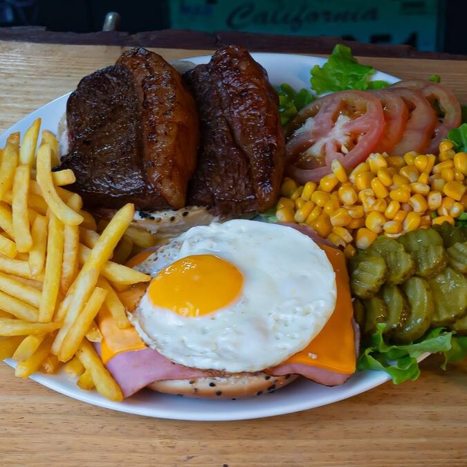 Alface, tomate, milho, picles, pão com gergelim preto, maionese, queijo, ovo, presunto, 120 gramas de batata frita e 200 gramas de picanha grelhada.