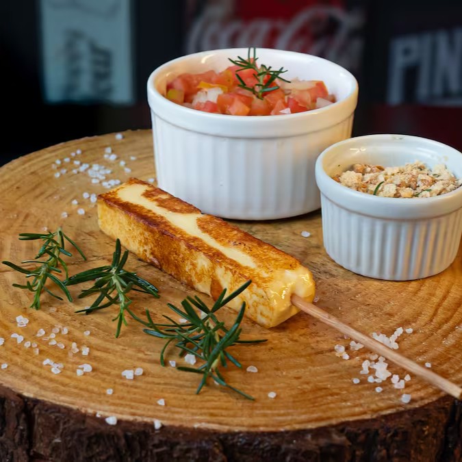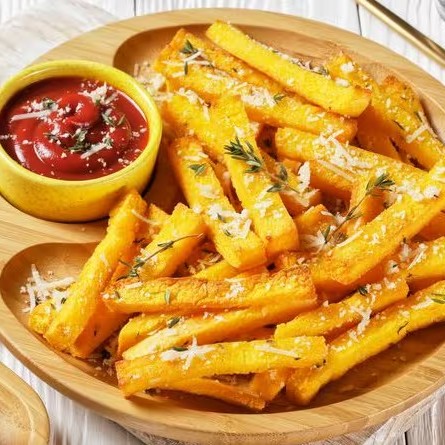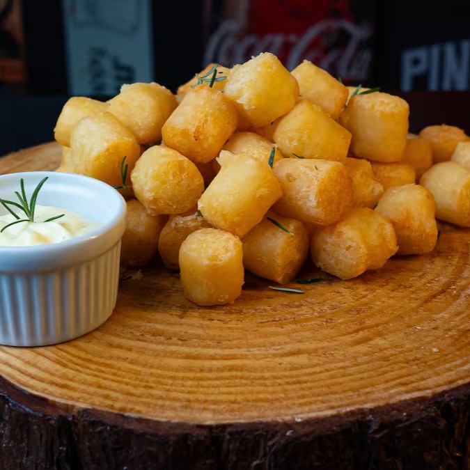 500 gramas (peso final) de polenta frita, queijo mussarela e cheiro verde.