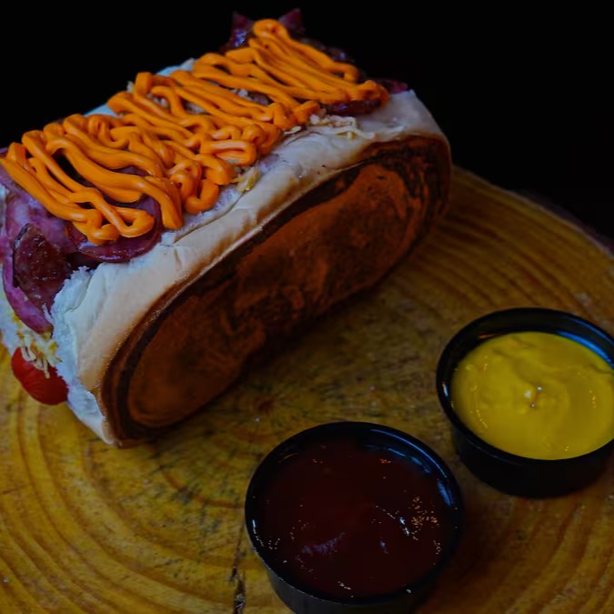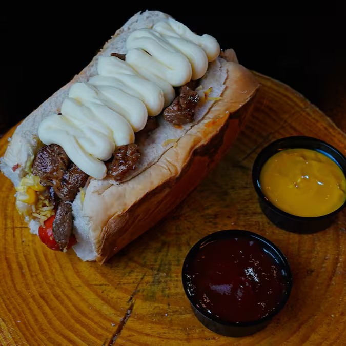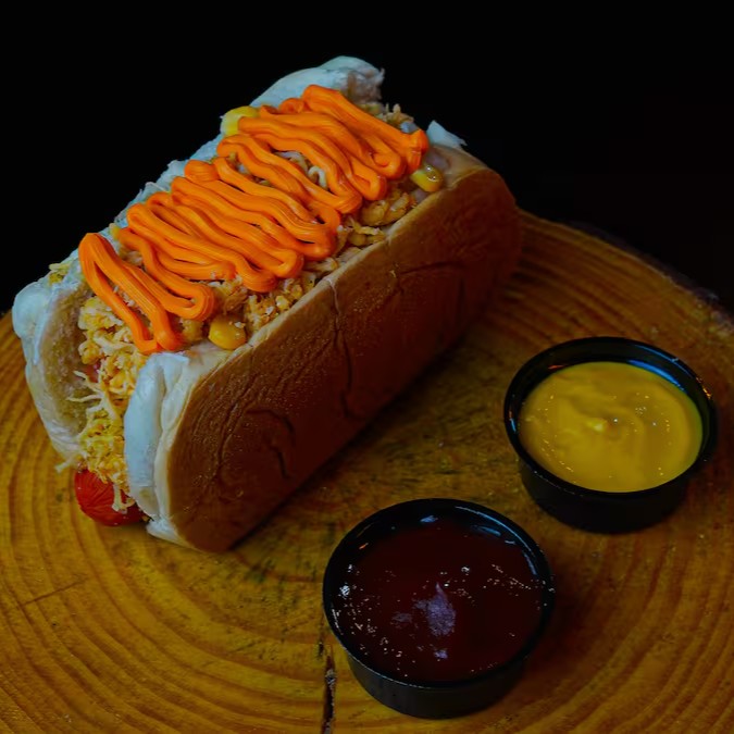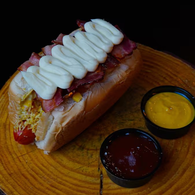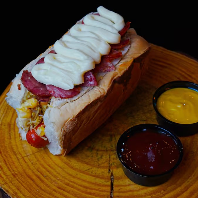 Pão, maionese, vina, bacon, frango, calabresa, Catupiry ou cheddar, molho vinagrete (cebola e tomate picados) ,milho e batata palha.