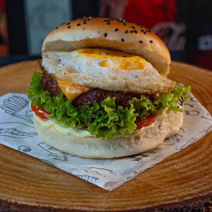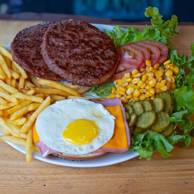 Alface, tomate, milho, picles, pão com gergelim preto, maionese, queijo, ovo, presunto, batata frita e 2 hambúrguers angus grelhados de 180g cada.