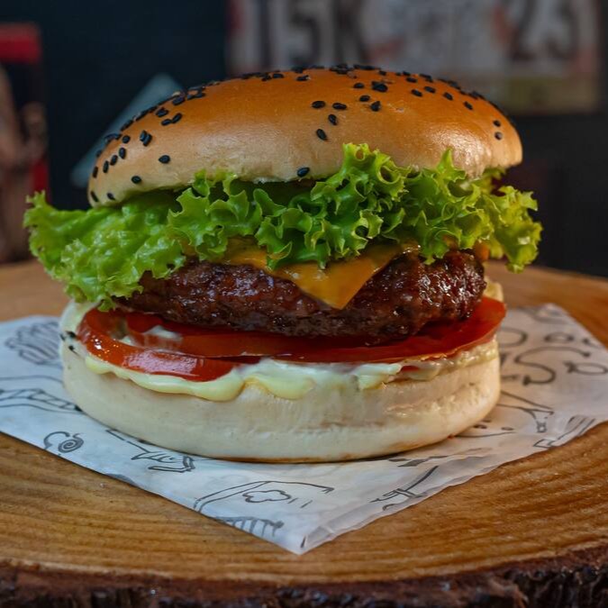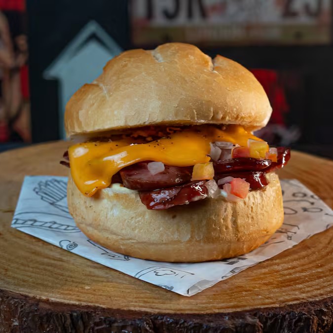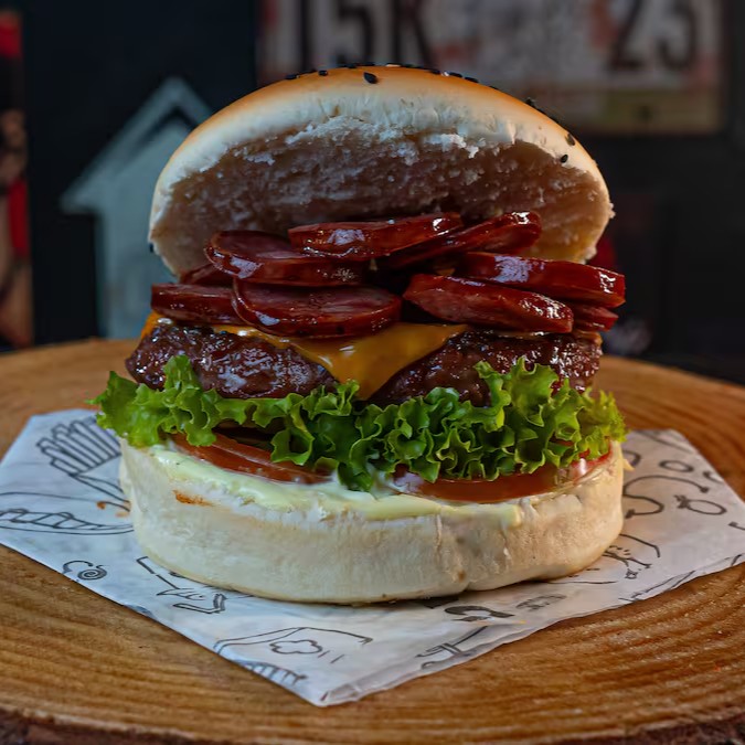 Pão com gergelim preto, maionese, hambúrguer de120g, calabresa, queijo cheddar, alface e tomate.