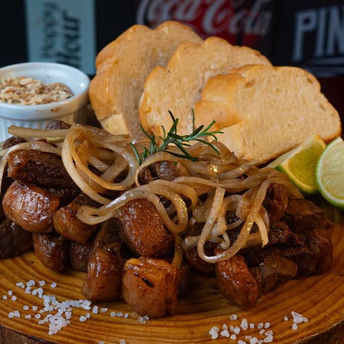 500 gramas (peso final) de alcatra, 1 porção de farofa, limão cortado, cebola refogada e pão francês.
