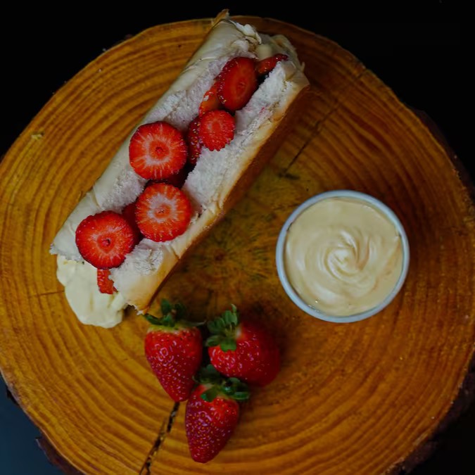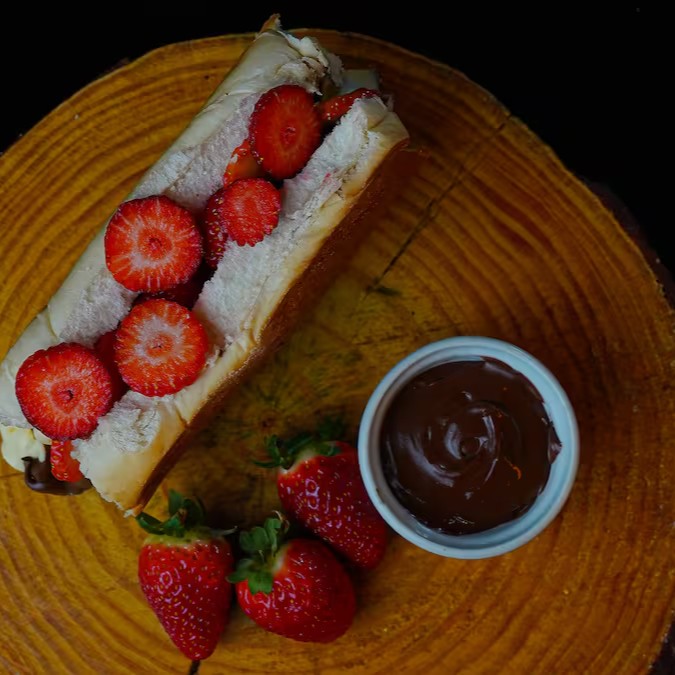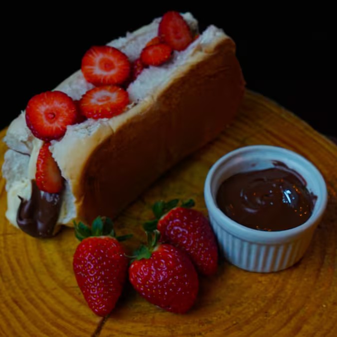 Sedutor e irresistível, o 'Sedução' é um hot dog doce que eleva o conceito de sobremesa a um novo patamar. Com um pão macio e fresco, este requintado deleite é generosamente preenchido com um chocolate cremoso e refinado, de cor branca, proporcionando uma experiência de sabor autêntica e indulgente. A cobertura é composta por ricos granulados de chocolate, que adicionam uma textura crocante irresistível ao prato. Finalizado com pedaços de morangos frescos e suculentos, o 'Sedução' é uma explosão de doçura equilibrada com a acidez ligeira das frutas, tornando-se um prato absolutamente viciante e delicioso.
