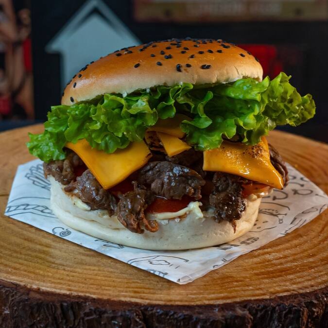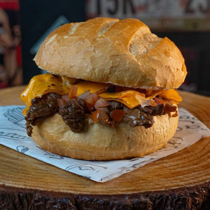 Pão com gergelim preto, maionese, 120 gramas de alcatra picado, queijo cheddar, alface e tomate.