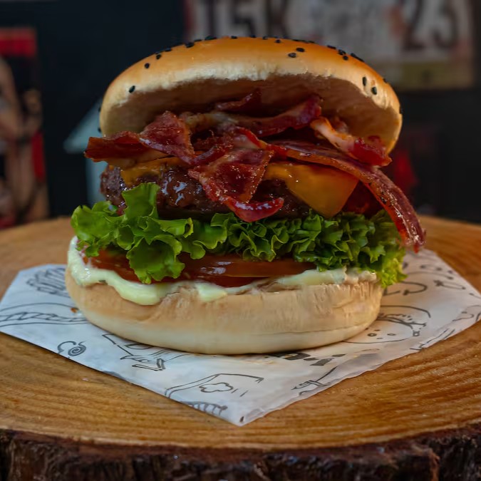 Apresentamos o 'Nobre Bacon', uma criação artesanal primorosa da categoria Hambúrguer. Este ícone gastronômico possui um pão incrivelmente macio, salpicado de gergelim preto, que envolve um suculento hambúrguer Angus de 180 gramas. Acompanhando, temos uma generosa camada de queijo cheddar derretido, tomates frescos, picles crocantes, cebola finamente fatiada, alface crocante e, por fim, um exuberante montante de bacon crocante. Cada mordida é realçada por uma untuosidade especial da nossa maionese caseira. É uma experiência gastronômica inigualável que satisfaz até os paladares mais exigentes.