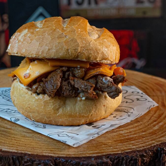 Pão francês, mignon Angus, queijo e molho vinagrete.