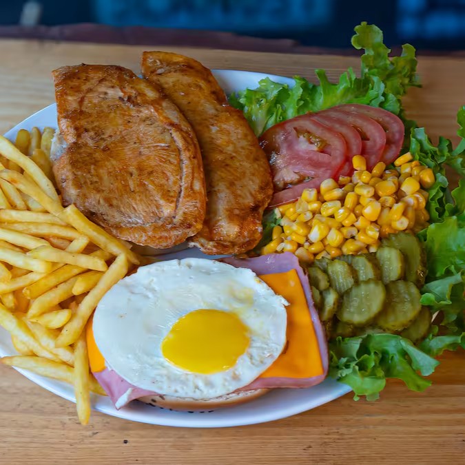 Alface, tomate, milho, picles, pão, maionese, queijo, ovo, presunto, batata frita e filé de frango grelhado de 200g.