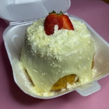 Massa branca de baunilha,cobertura creme de Ninho com raspas de chocolate branco, peso aproximado 250g,serve 1 pessoa.